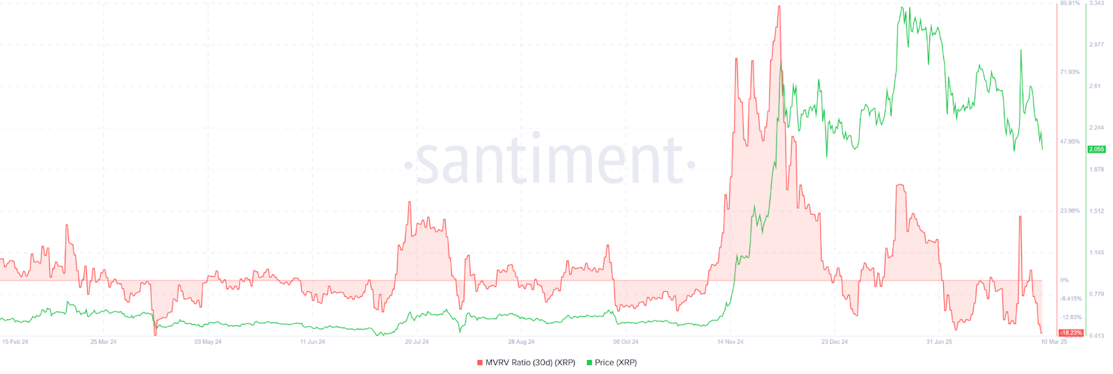 - Данные от Santiment показывают, что 30-дневное отношение MVRV для XRP упало до -16%, что является самым низким показателем с апреля 2024 года.