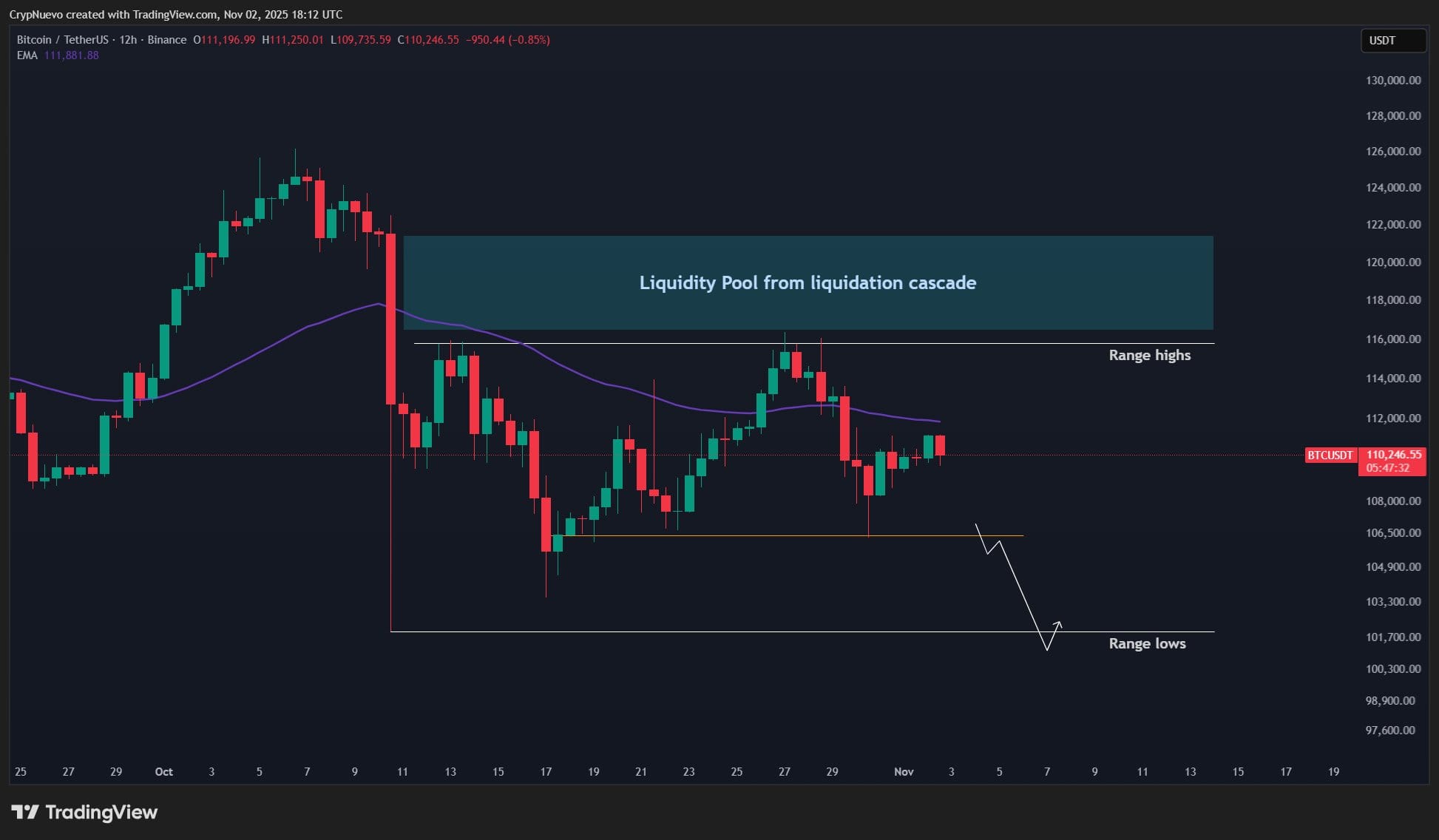 CrypNuevo отметил, что эти низкие уровни имеют ключевое совпадение с 50-недельной экспоненциальной скользящей средней (EMA) на уровне $101,150, увеличивая вероятность их в качестве целевой нижней границы. Биткоин вернулся к этой области на Binance во время резкого падения с исторических максимумов в $126,200 в октябре.