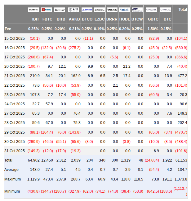 Данные британской инвестиционной компании Farside Investors показывают три последовательных дня оттоков средств из американских спотовых ETF Биткоина до 31 октября.