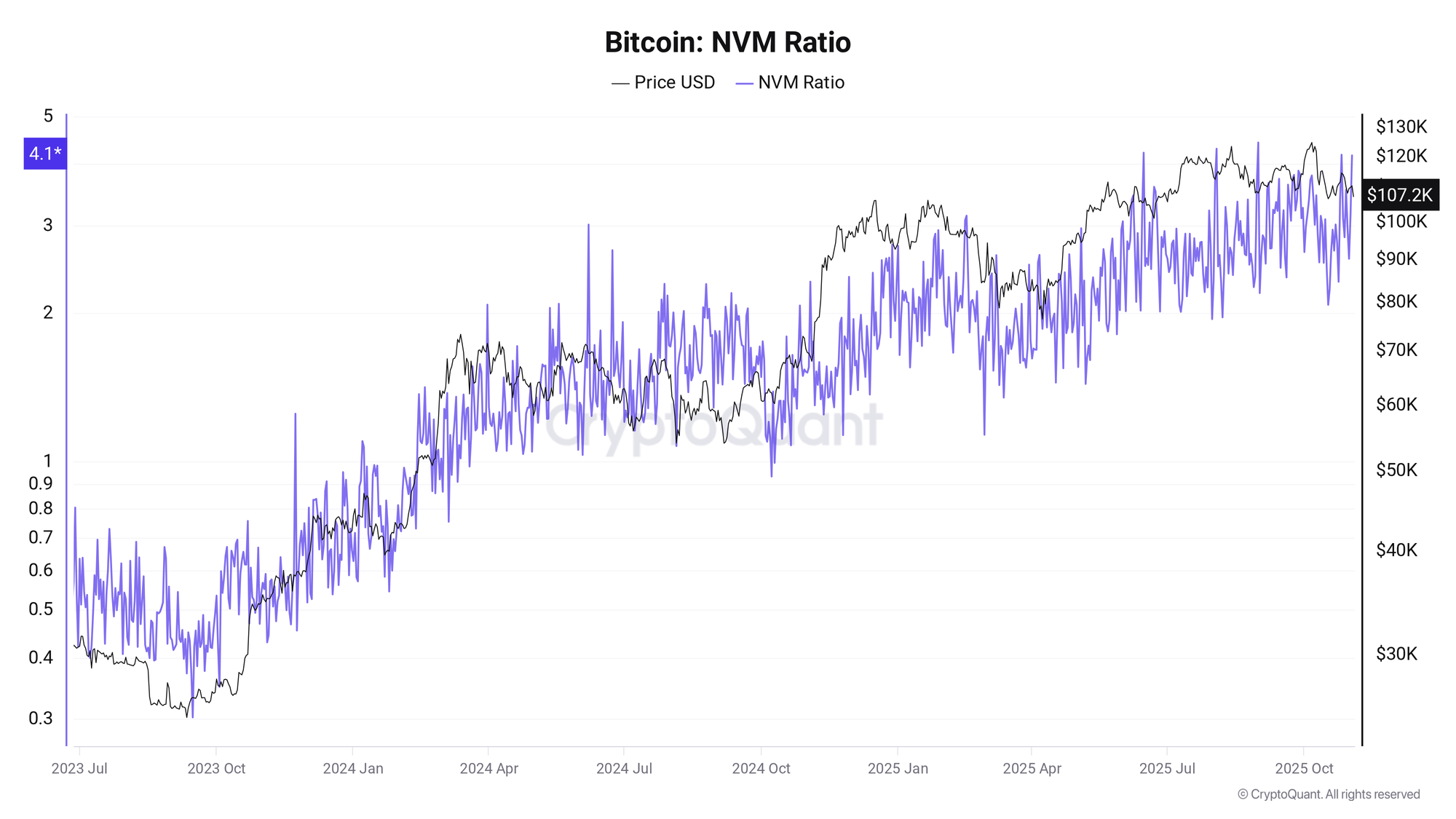 "Когда Индикатор Стоимости Сети Биткоина резко поднимается выше 1, и особенно выше 2, цена исторически имела тенденцию к снижению после этого", — объяснили в сообщении в Quicktake.