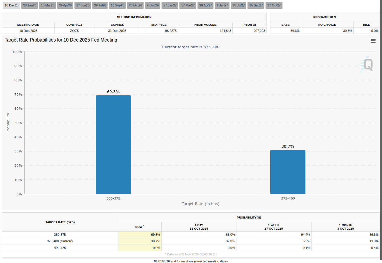 Данные FedWatch Tool CME Group ставят вероятность снижения ставки на следующем заседании Федрезерва в декабре в 63%.