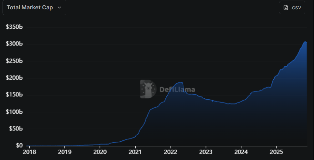 Стейблкоины также были областью быстрого роста, так как банки по всему миру исследуют эту технологию. Рыночная капитализация стейблкоинов составляет примерно 305 миллиардов долларов на пятницу, согласно платформе аналитики блокчейнов DefiLlama.