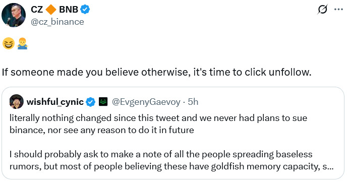 Бывший генеральный директор Binance Чанпэн Чжао высказался по этому поводу, посоветовав своим 10,4 миллиона подписчиков в X всегда проверять информацию через «официальные источники.»