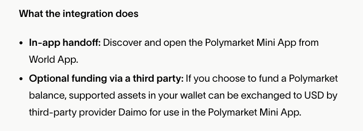 Запуск Mini App от Polymarket на платформе World позволяет пользователям World App делать ставки Polymarket непосредственно из кошелька World App.