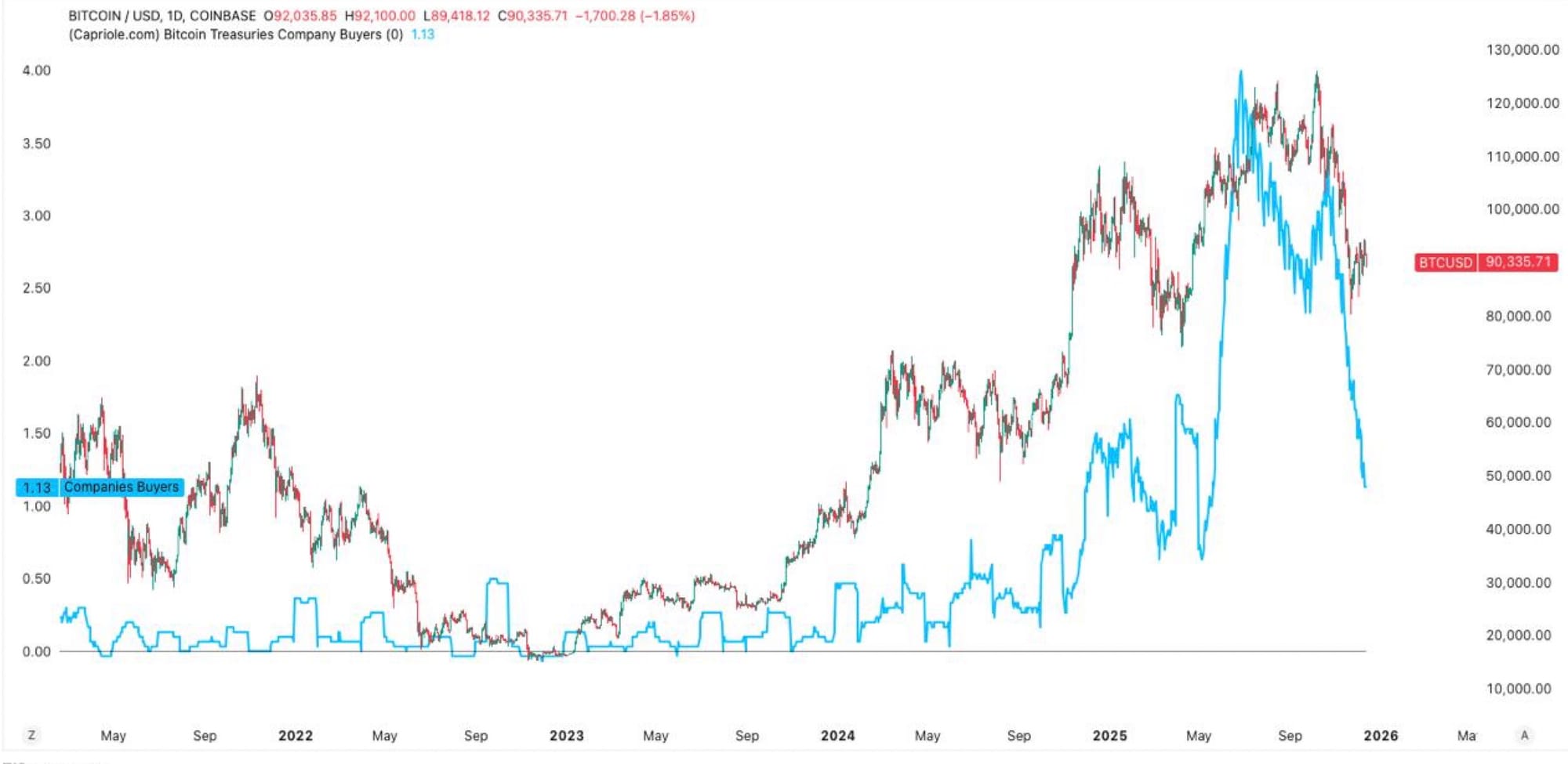 Данные показывают, что темп покупок Bitcoin компаниями в день продолжает снижаться, что может быть признаком истощения институциональных инвесторов.