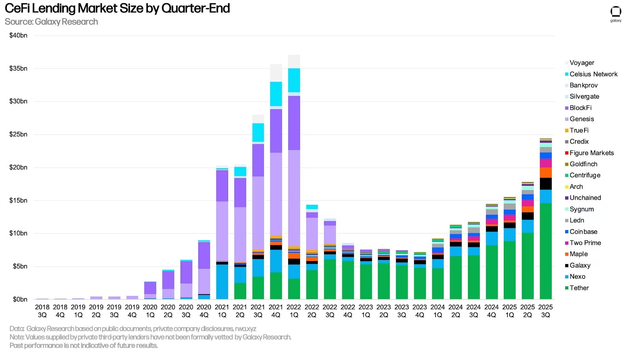 Рынок криптовалютных кредитов стал более прозрачным, возглавляемый такими компаниями, как Tether, Nexo и Galaxy, и достиг общего объема кредитного портфеля почти в 25 миллиардов долларов к третьему кварталу.
