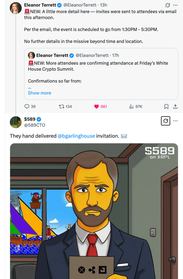 Хотя в списке Терретт не появился генеральный директор Ripple Брэд Гарлингхаус, он ранее намекнул на свое участие в публикации 2 марта на X вскоре после того, как крипто-царь Трампа Сакс объявил о саммите 1 марта.