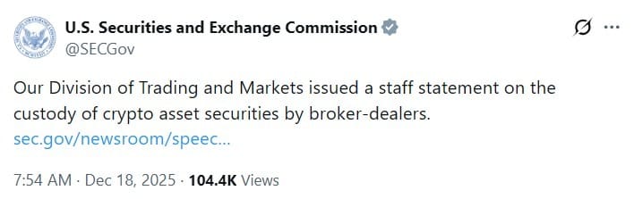В среду Департамент торговли и рынков Комиссии по ценным бумагам и биржам США (SEC) изложил, как брокеры-дилеры могут хранить токенизированные акции и облигации в соответствии с существующими правилами защиты клиентов. Это сигнал к тому, что крипто-активы на основе блокчейн-технологий будут помещены в рамки традиционных мер защиты ценных бумаг, а не рассматриваться как новая категория.