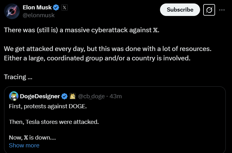 Социальная платформа X подверглась «массивной кибератаке», которая мешала некоторым пользователям получить доступ к сайту, сообщил 10 марта владелец платформы Илон Маск.