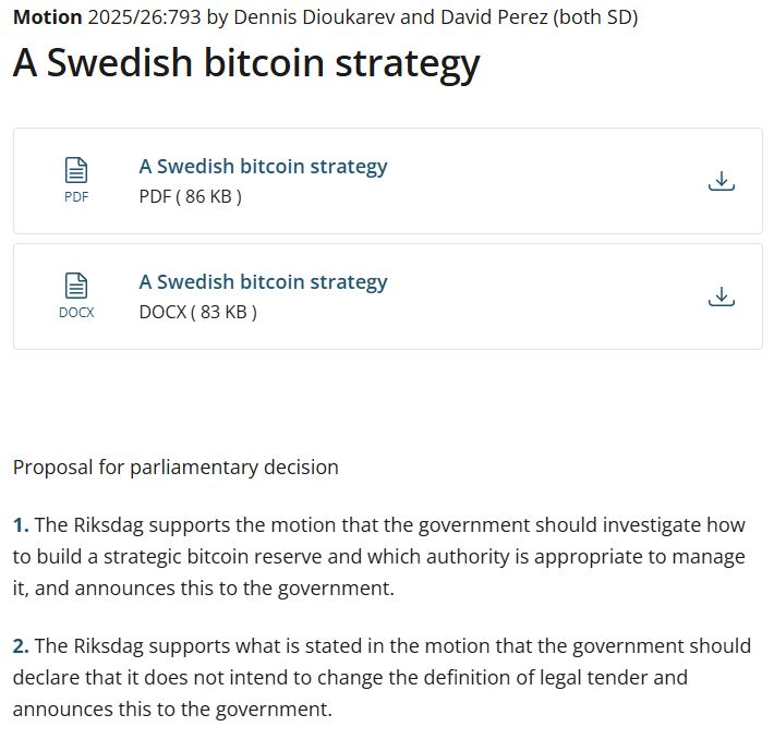 В своем предложении в Риксдаге в среду шведские демократы Деннис Дьюкарев и Дэвид Перес заявили, что, учитывая, что такие страны, как США, уже находятся в процессе создания резерва, Швеция должна "участвовать в этой цифровой гонке вооружений и присоединиться к растущей группе стран, которые приняли и признали потенциал Bitcoin".