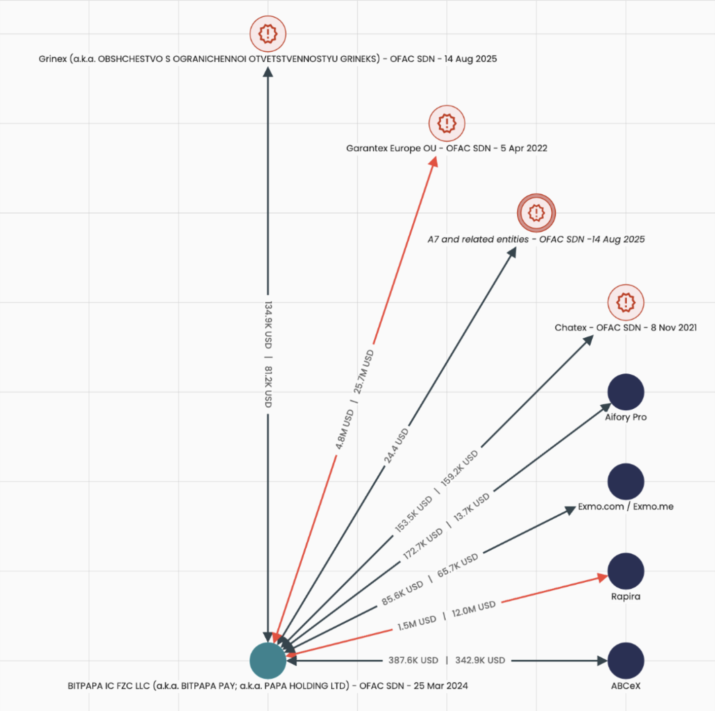 По оценке компании, около 9,7% исходящих криптопереводов Bitpapa направляются адресатам, подпадающим под санкции OFAC. Также утверждается, что биржа управляет кошельками так, чтобы затруднять применение санкций, постоянно меняя адреса.