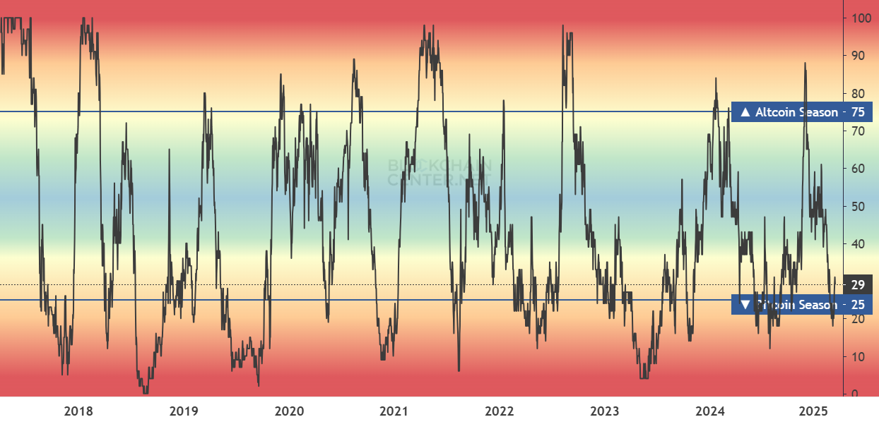 Центр Блокчейна определяет сезон альткоинов как период, когда 75% из топ-50 альткоинов превосходят Биткоин за 90-дневный период. Индекс альтсезона показал рост в марте 2024 года и снова в январе 2025 года, но ни один из этих подъёмов не продлился достаточно долго, чтобы считаться полноценным альтсезоном.
