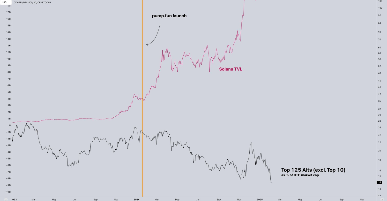 По мнению криптоаналитика Майлза Дойчера, запуск проекта Pump.fun напрямую связан с разрушением рынка альткоинов по отношению к BTC.