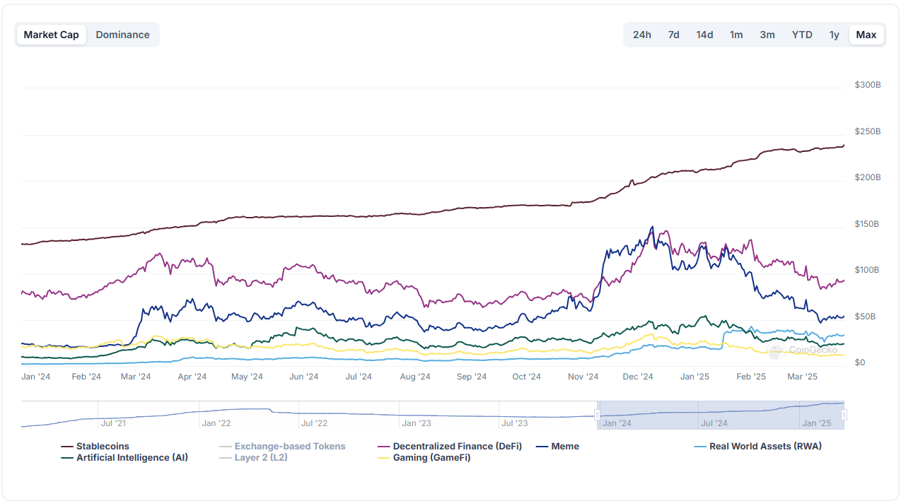 Более пристальное изучение ценовых движений подтверждает эту идею. Согласно данным CoinGecko, основные категории альткоинов в этом цикле резко разошлись. Токены реальных активов (RWA) выросли в 15 раз. Игра блокчейна, наоборот, потеряла половину своей рыночной капитализации. Это говорит о том, что нарративы играют все большую роль в принятии решений инвесторами о распределении капитала.