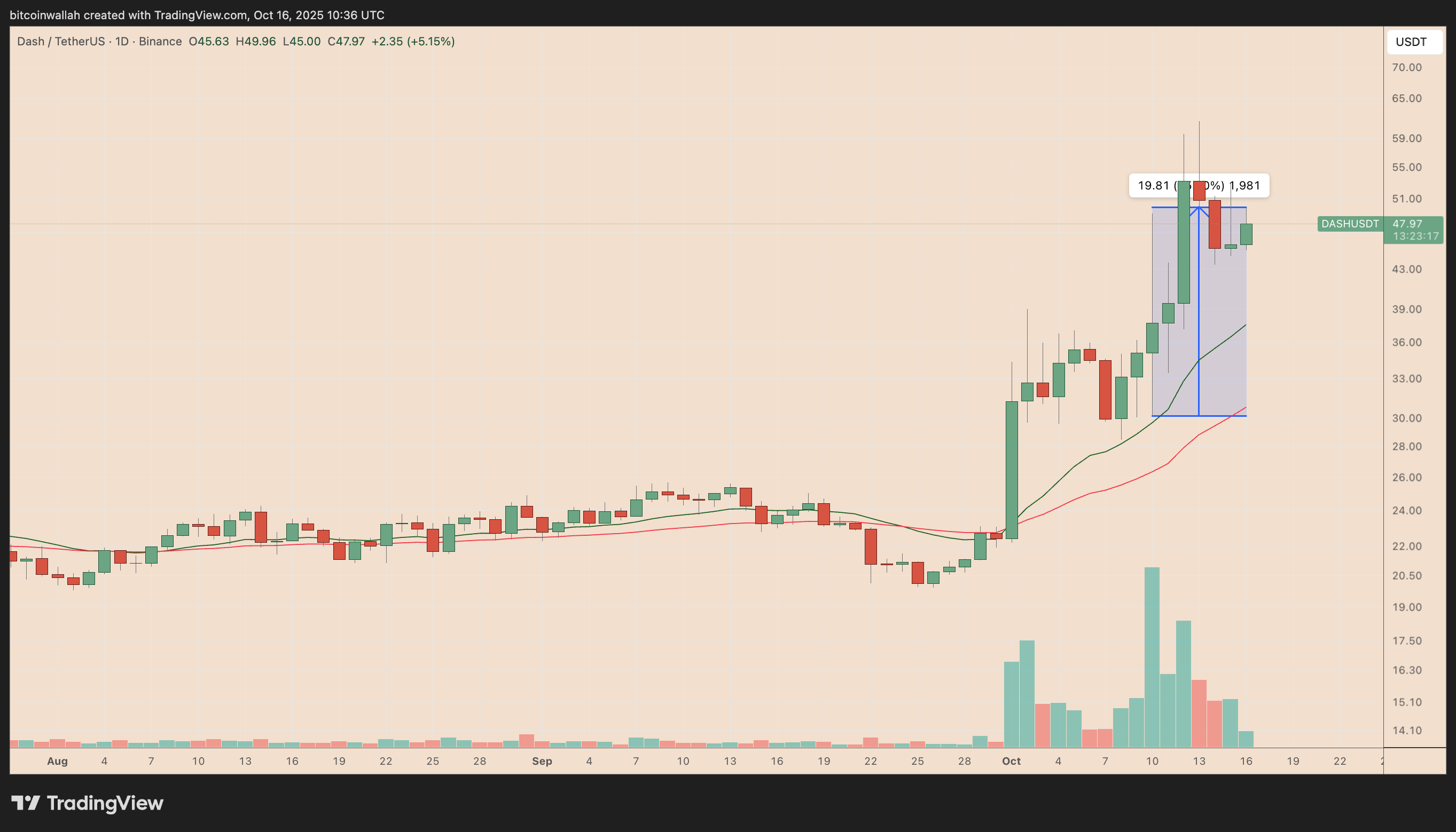 DASH вырос более чем на 65% с момента падения 9 октября, торгуясь на уровне около $50 на четверг. За последний месяц его доходность составила почти 150%.