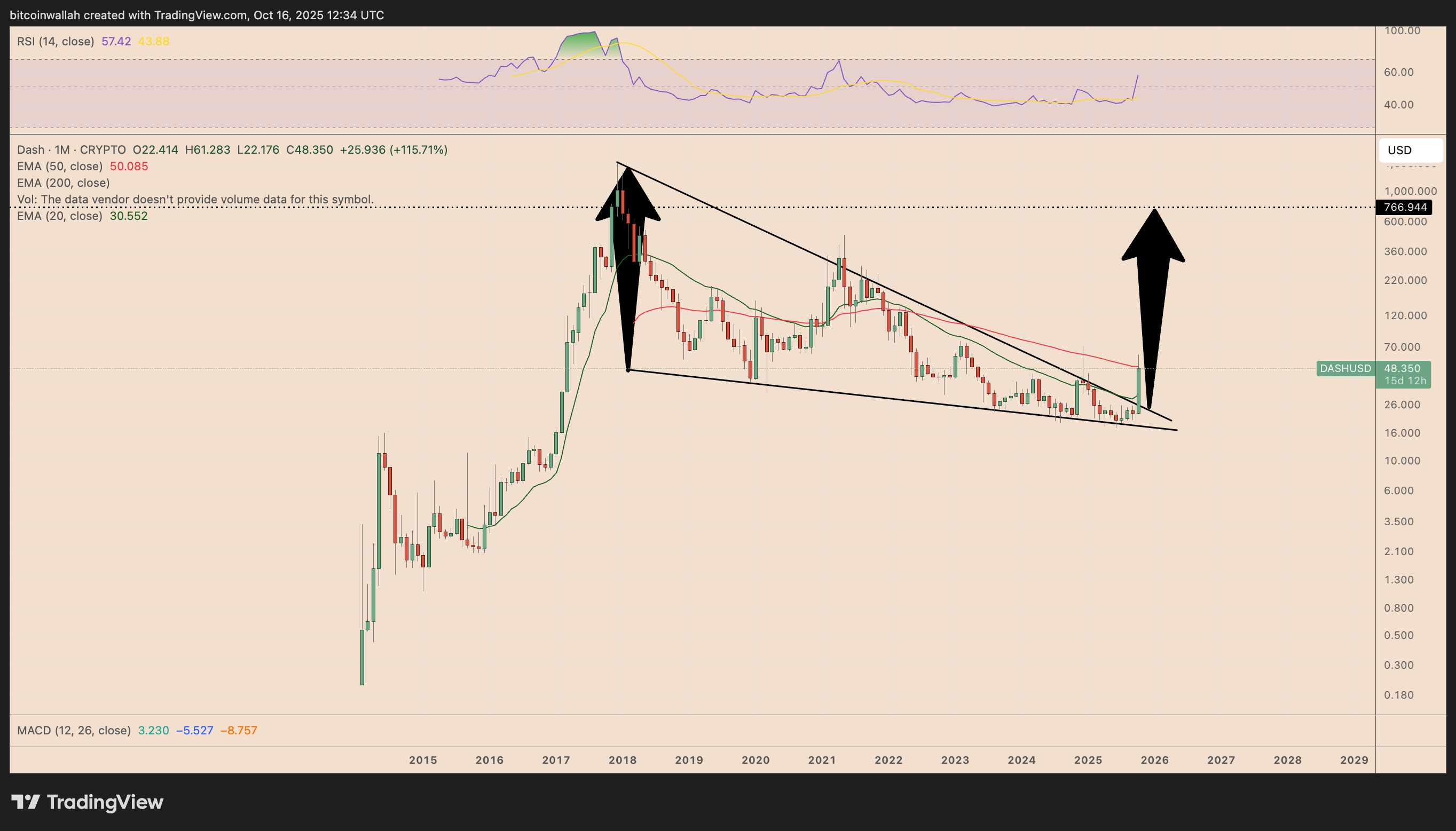 И Zcash, и Dash прорываются из многолетних нисходящих клиновидных паттернов, что часто предсказывает сильное продолжение роста.