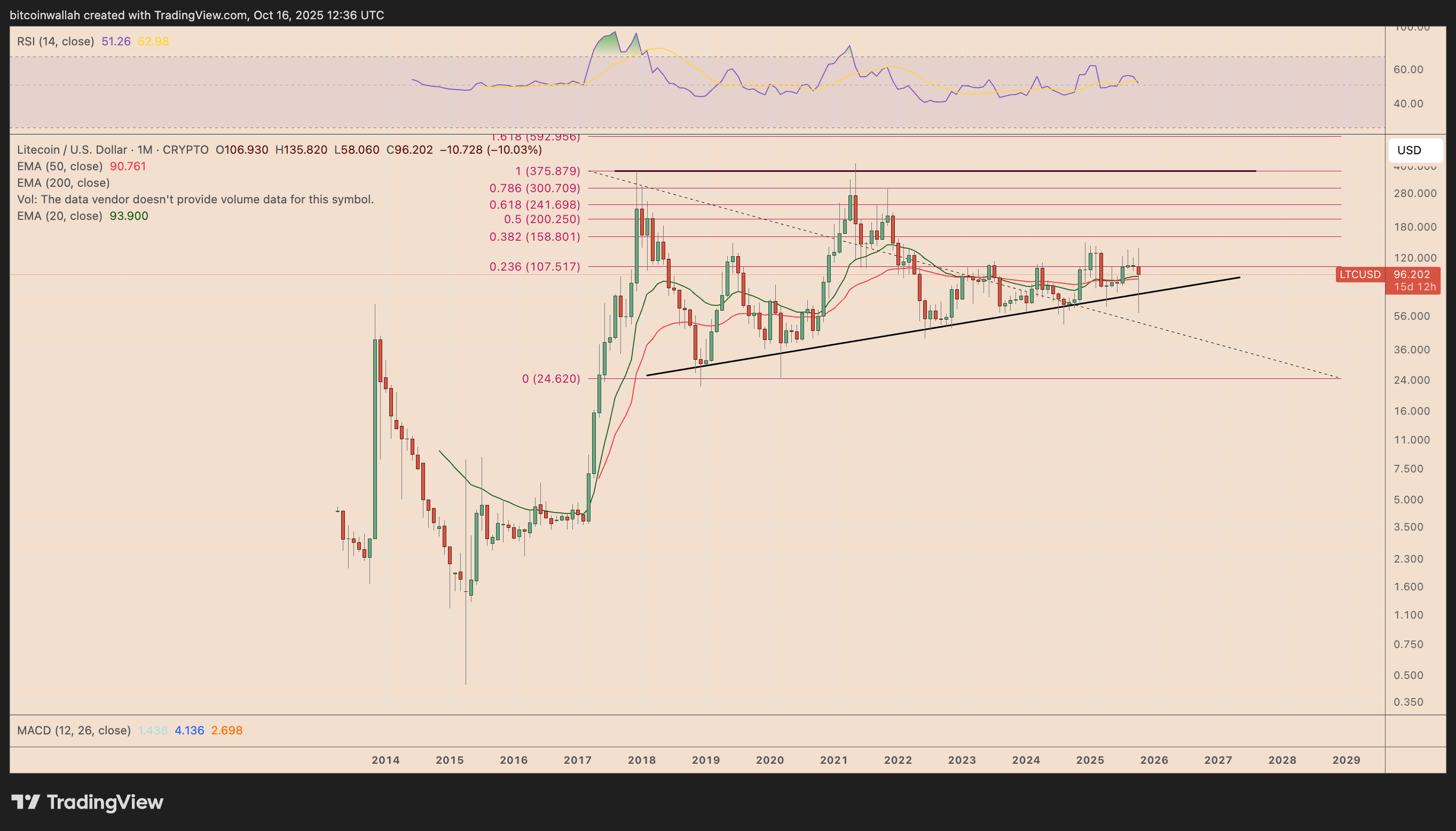 LTC остается внутри восходящего треугольного паттерна, определяемого серией более высоких минимумов с 2022 года.