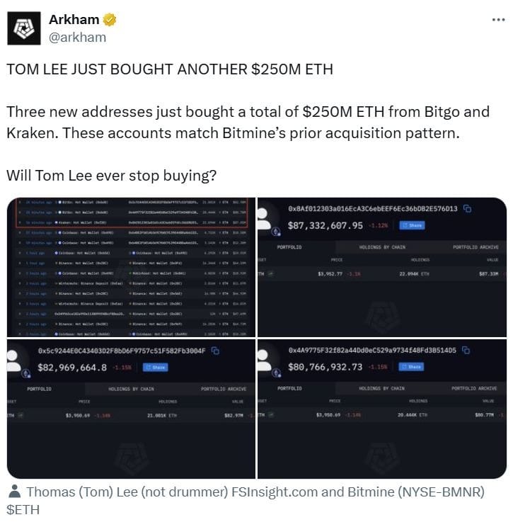 В понедельник BitMine приобрела еще Ether на сумму $250 миллионов на криптобиржах Bitgo и Kraken, согласно данным аналитической платформы блокчейн Arkham Intelligence.