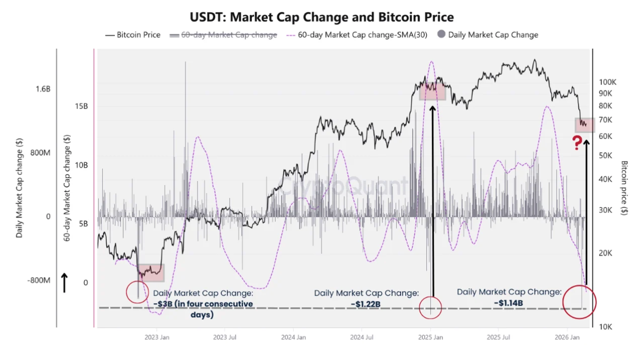 В воскресенье 60-дневное изменение рыночной капитализации Tether USDt снизилось на $3,1 млрд, вернувшись в исторически важную зону, совпадавшую с минимумами медвежьего рынка Bitcoin в 2022 году.
