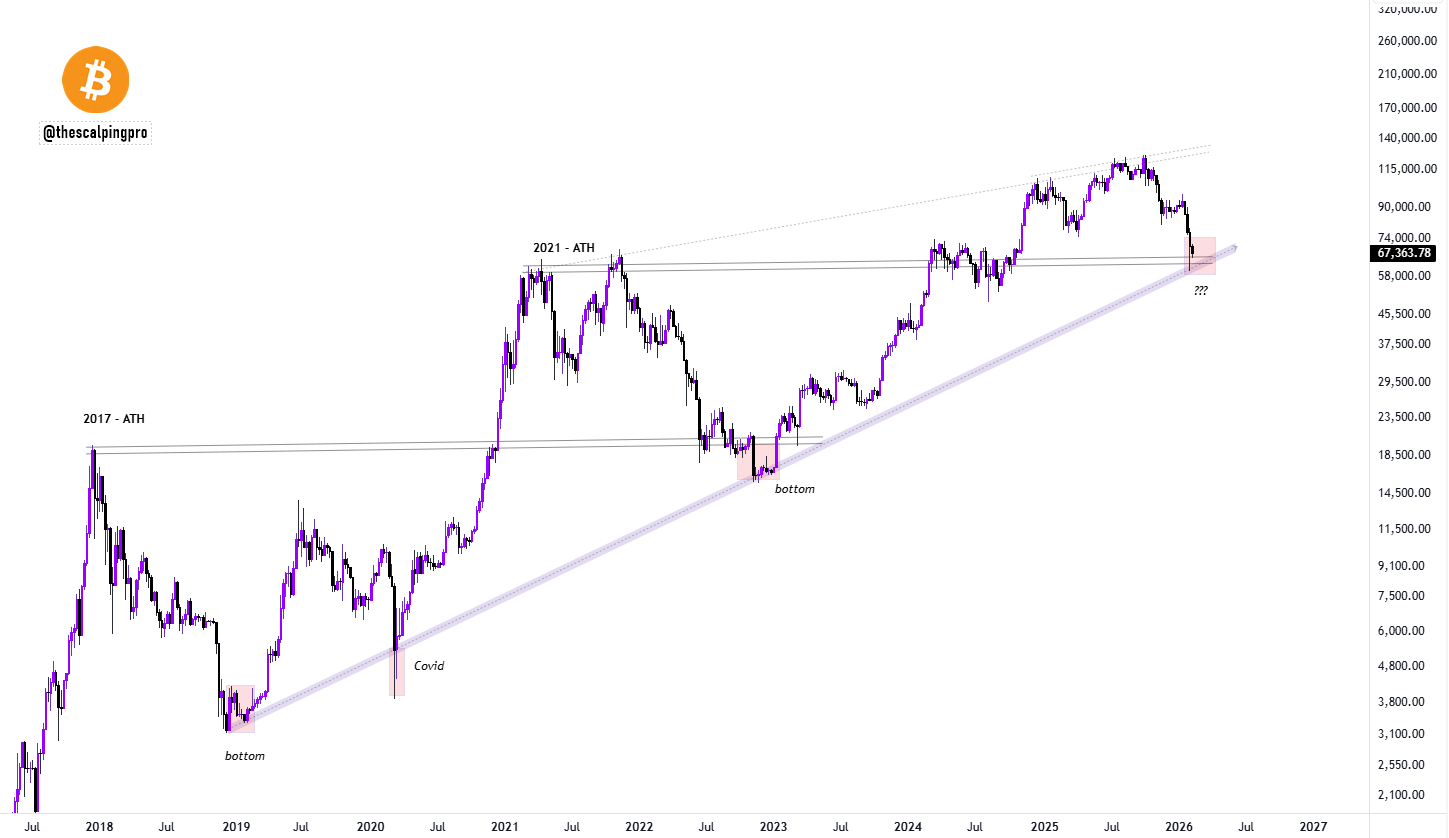 Аналитик Mags отметил, что «Bitcoin одновременно тестирует две ключевые зоны поддержки»: восходящую линию тренда, которая работала в 2022 году, и горизонтальный уровень поддержки, сформированный от исторического максимума 2021 года.