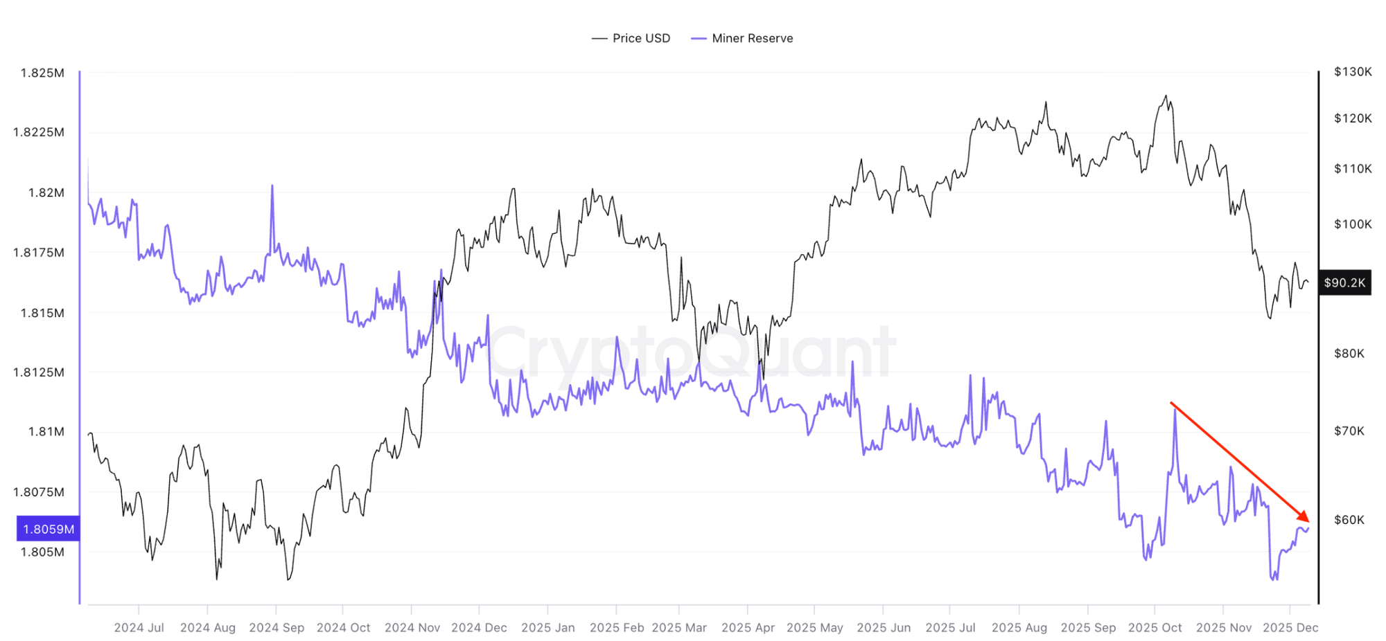 Хотя резервы BTC у майнеров оставались более или менее стабильными на протяжении 2025 года, объем продаж с начала октября остается стабильно высоким. Известные кошельки майнеров насчитывают около 1.8 миллиона BTC, что на 5,000 BTC меньше с 10 октября.