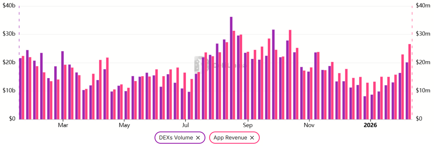 Недельные объемы торгов на DEX в сети Ethereum выросли до $20 млрд против $9,8 млрд месяцем ранее. На этом фоне выручка DApps достигла $26,6 млн за семь дней, завершившихся 8 февраля, что рассматривается как здоровый индикатор спроса на ETH. Solana по-прежнему лидирует с $31,1 млн недельной выручки DApps, однако разрыв между сетями сокращается.