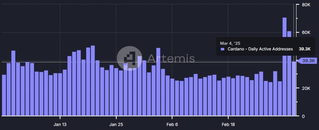Данные Artemis показывают, что 4 марта Cardano зафиксировала менее 40 000 активных пользователей в день, тогда как у Solana их было более 5 миллионов — хотя Solana также подвергалась резкой критике за активности ботов.