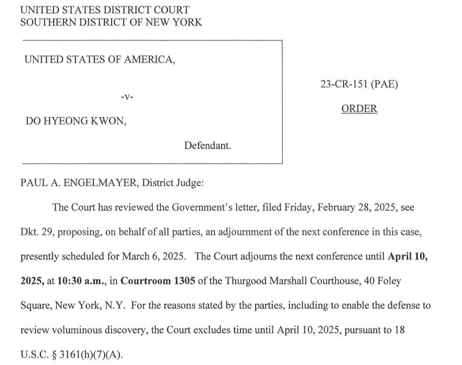 Федеральный судья Манхэттена отложил дело правительства США против бывшего генерального директора Terraform Labs До Квона после того, как прокуратура попросила больше времени на рассмотрение дополнительных четырех терабайт доказательств.