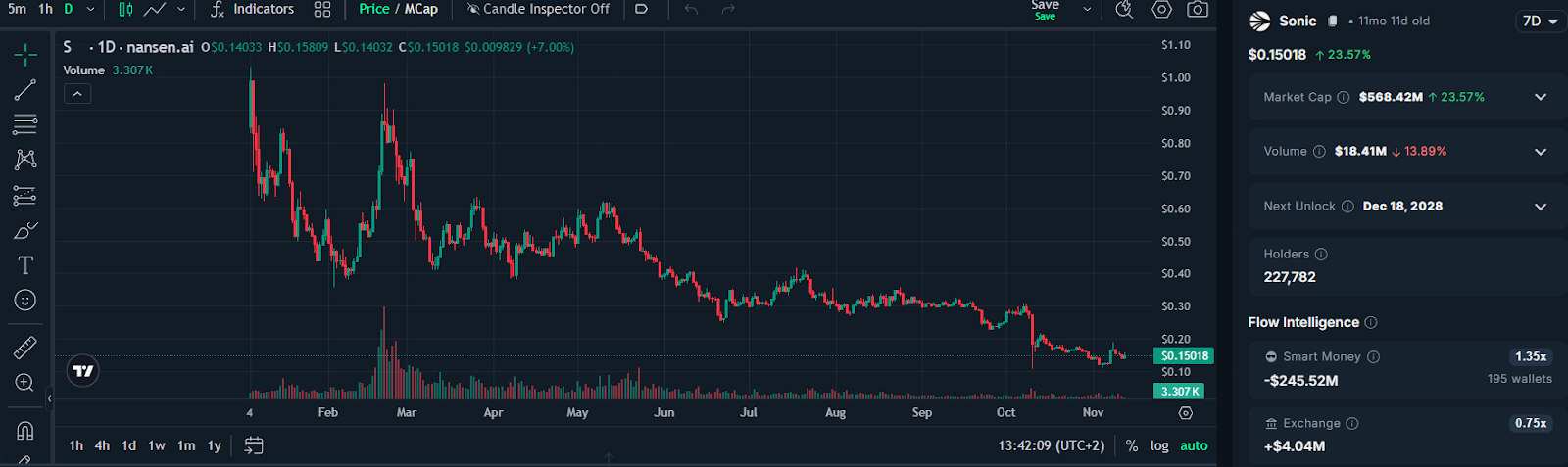 Эта новость может стать обнадеживающим сигналом для держателей токенов Sonic. Токен упал более чем на 80% с момента ребрендинга протокола с Fantom в январе и более чем на 20% только за прошлый месяц, согласно данным с платформы крипторазведки Nansen.
