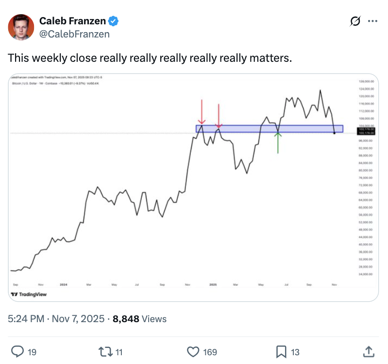 “Ключевой уровень недели: $103.5K,” написал трейдер Titan of Crypto в посте на X.