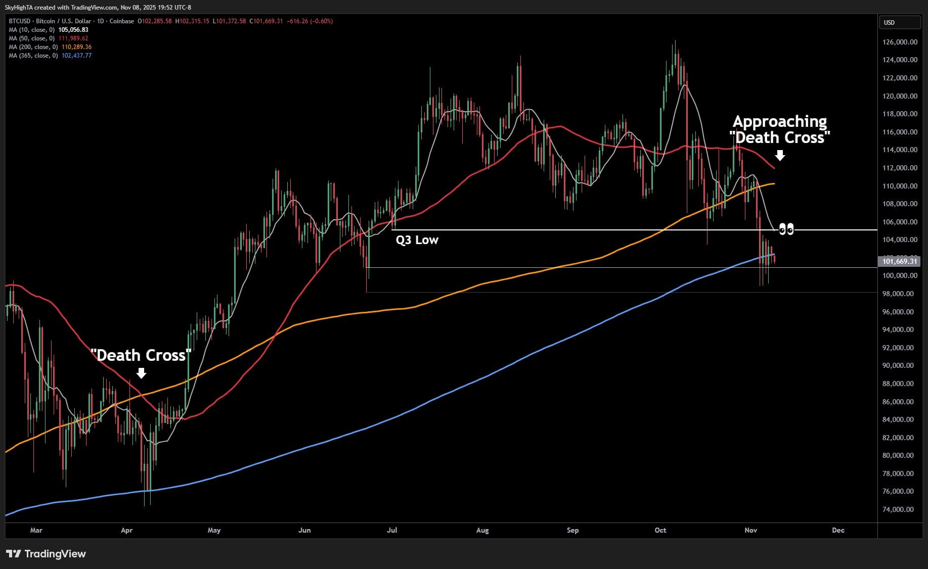 Сможет ли Bitcoin избежать четвёртого "креста смерти" на уровне $102K?