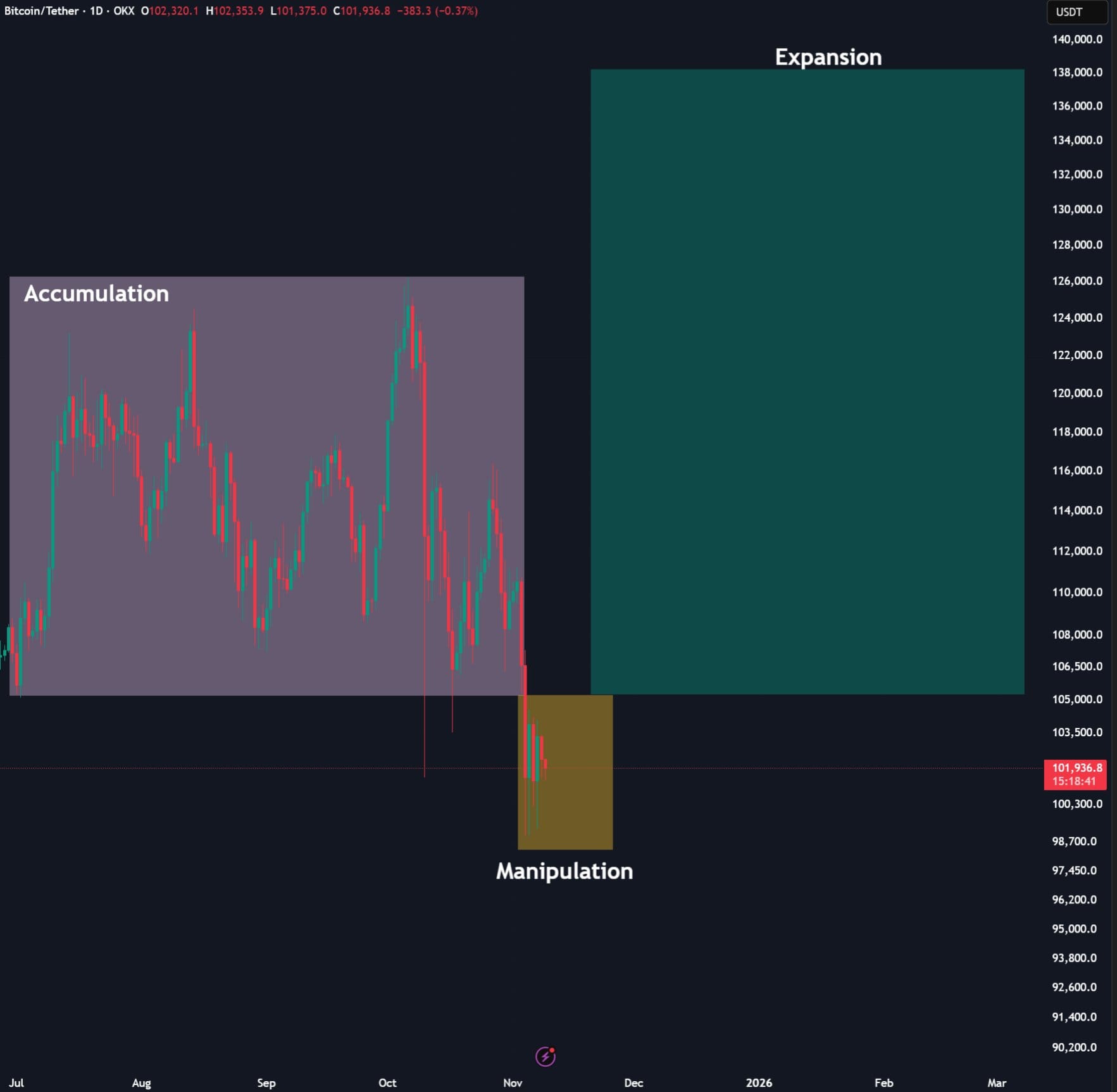Abbe поделился графиком на X, который предполагал, что конец шатдауна также может подвести черту под фазой "манипуляции" в движении цен на BTC.