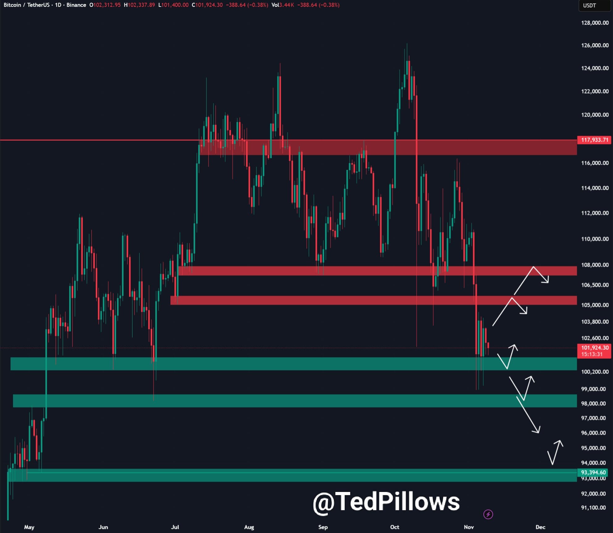 “BTC всё ещё консолидируется вокруг уровня $102,000. Рынки ожидали окончания шатдауна правительства в эти выходные, но этого не произошло,” он заявил.