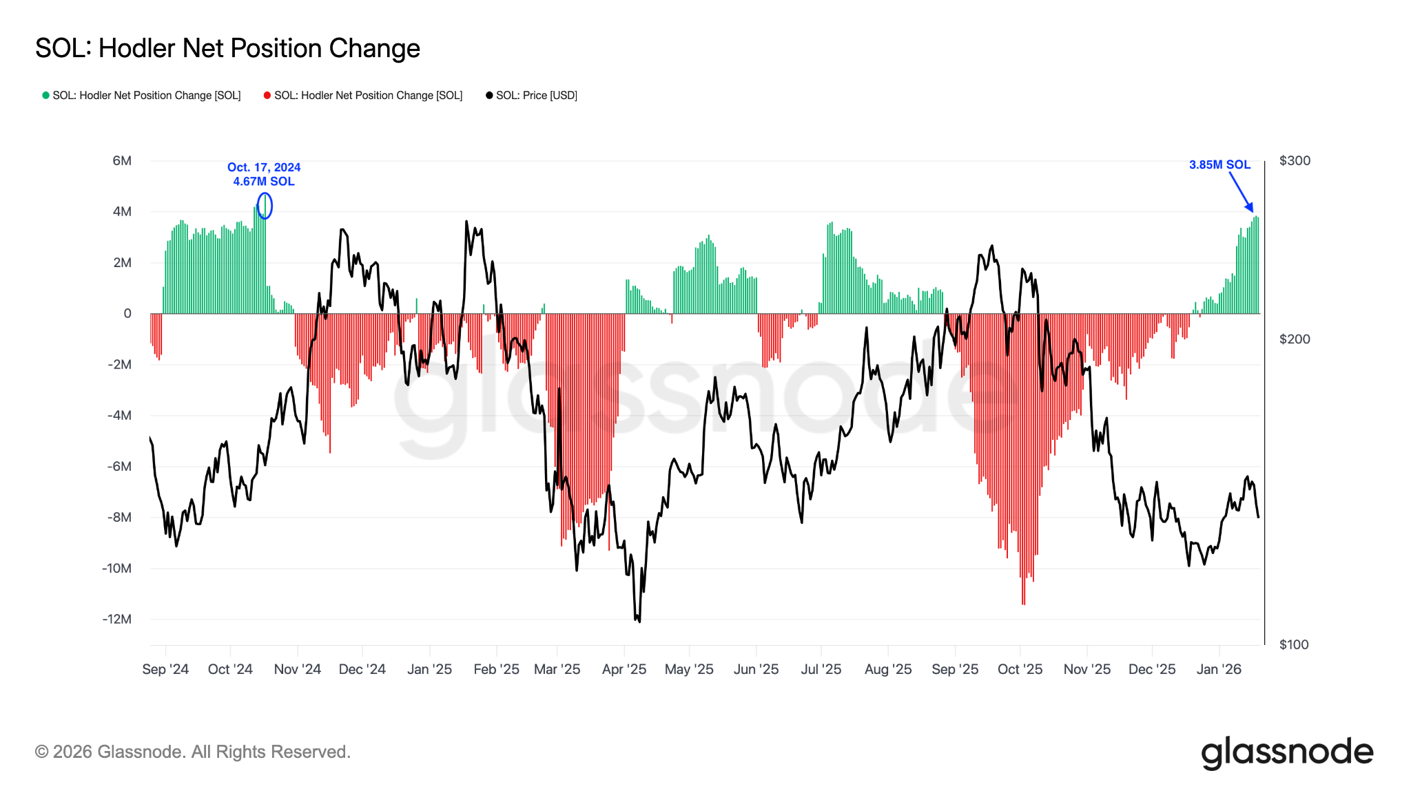Показатель Hodler net position change остается положительным с последней недели декабря 2025 года и в воскресенье достиг 15-месячного максимума на уровне 3,85 млн SOL. Это означает, что держатели вновь начали накапливать SOL в ожидании дальнейшего роста цен.