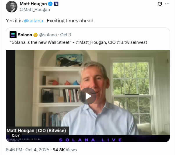 Это не первый раз, когда руководители Bitwise выражают оптимизм в отношении Solana (SOL). Выступая на конференции Token2049 в Сингапуре на прошлой неделе, генеральный директор Bitwise Хантер Хорсли заявил, что Solana может получить преимущество перед Ethereum на рынке обменных фондов (ETF), ссылаясь на её дизайн, который более привлекателен для инвесторов.