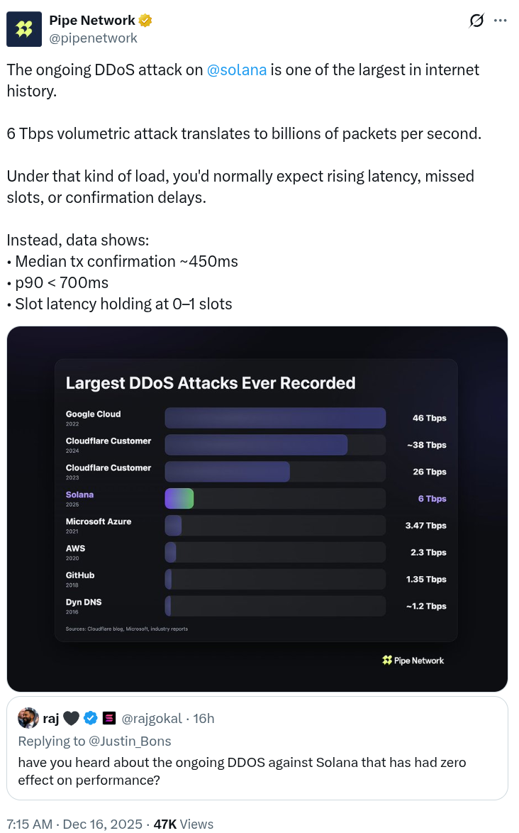 DDoS-атака включает в себя множество устройств, поглощающих цель трафиком, чтобы перегрузить ее и вывести из строя или замедлить. Диаграмма, опубликованная Pipe Network, предполагает, что Solana столкнулась с четвертой по величине DDoS-атакой, зарегистрированной когда-либо. Тем не менее, в 2025 году Cloudflare сообщила о атаке в 29,7 Тбит/с, KrebsOnSecurity сообщила об атаке в 6,3 Тбит/с, а Gcore раскрыла атаку в 6 Тбит/с, ни одна из которых не появилась на диаграмме Pipe Network.