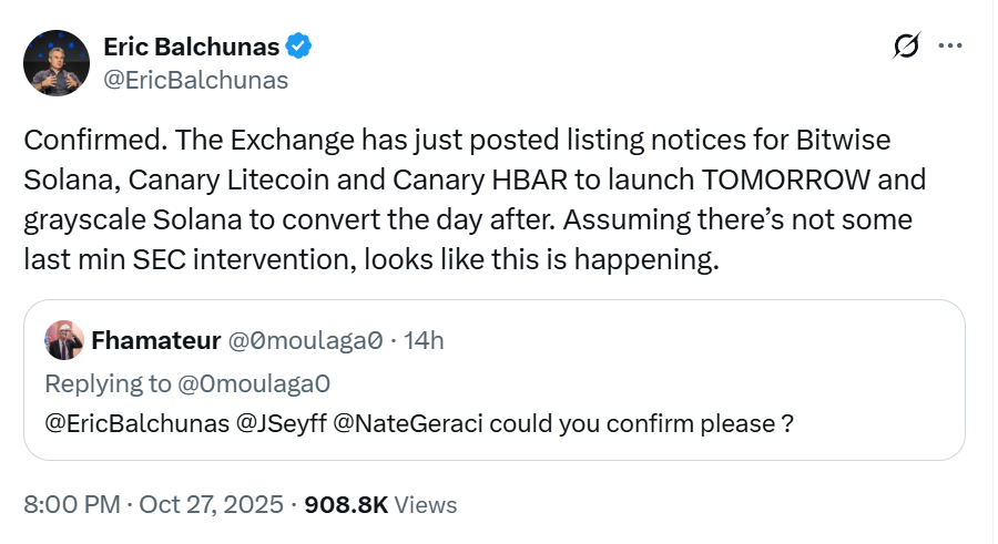 По крайней мере, три альткоин ETF, включая Solana (SOL) от Bitwise, Litecoin (LTC) и Hedera (HBAR) от Canary, выйдут на рынок во вторник, сообщает аналитик Bloomberg Эрик Балчунас.