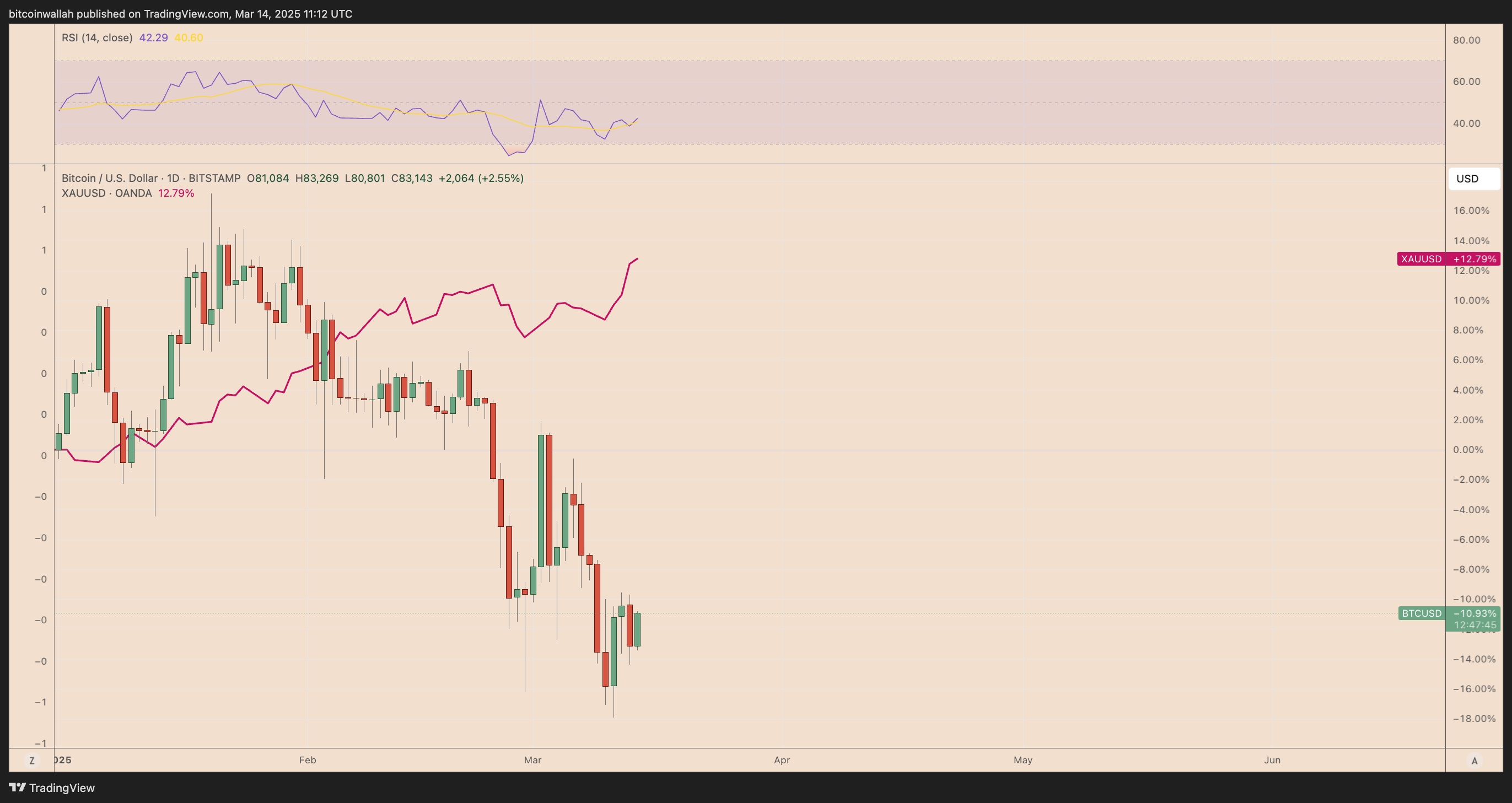 График динамики BTC/USD и XAU/USD с начала года. Источник: TradingView