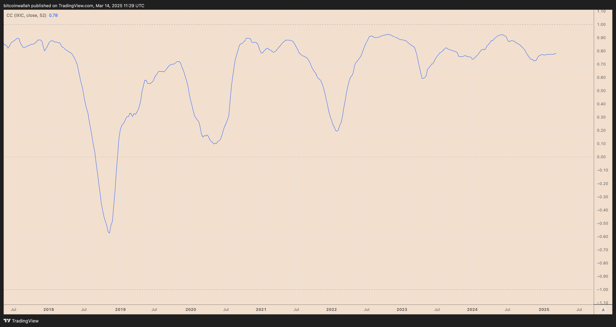 Коэффициент корреляции BTC/USD и Nasdaq Composite за 52 недели. Источник: TradingView