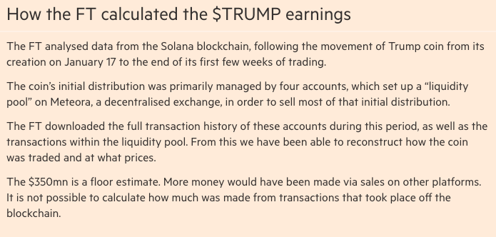 По данным нового анализа Financial Times, криптовалютный проект бывшего президента Дональда Трампа принес как минимум 350 миллионов долларов дохода от запуска официальной мем-монеты Trump (TRUMP).