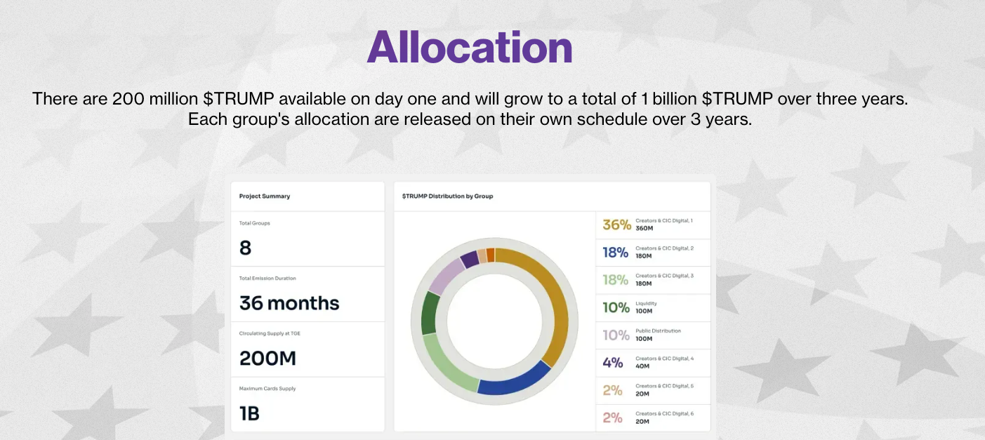 Запуск включал в себя выпуск 1 миллиарда токенов TRUMP, из которых первые 200 миллионов были выпущены в первой партии мем-монет, а оставшиеся 800 миллионов планируется выпустить в течение следующих трех лет.
