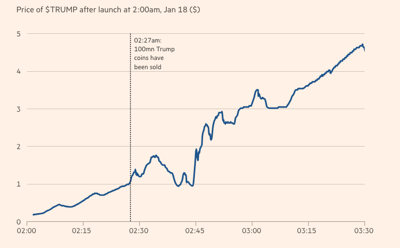 Согласно анализу FT, связанные с Трампом аккаунты продали первые 100 миллионов токенов Trump на следующий день после запуска мем-монеты по цене ниже 1,05 доллара.