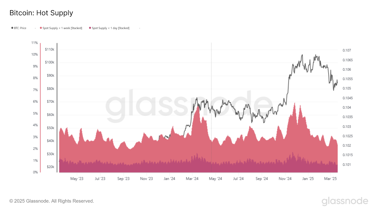 Метрика "горячего" предложения Биткоина, которая отслеживает монеты в возрасте не более недели, снизилась более чем на 50%, с 5.9% в конце ноября до 2.3% на 20 марта, согласно данным Glassnode.