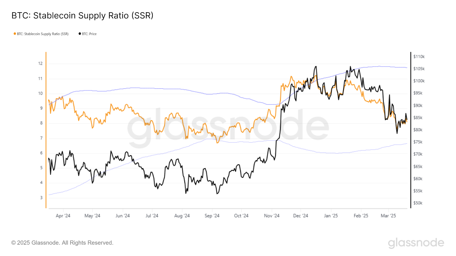 Значение SSR находится на более чем четырехмесячном минимуме — 8, который последний раз наблюдался в начале ноября 2024 года, когда Биткоин торговался по цене $67,000, незадолго до послевыборного ралли, которое привело BTC к новому рекордному максимуму в $109,000.