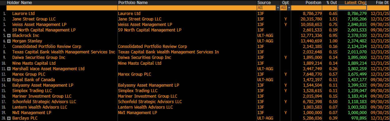 Помимо Laurore и Jane Street, в четвертом квартале 2025 года ряд компаний заметно изменил позиции в IBIT. Сообщается, что Weiss Asset Management добавила около 2,8 млн акций (примерно $107,5 млн), а 59 North Capital увеличила долю на 2,6 млн акций (около $99,8 млн).