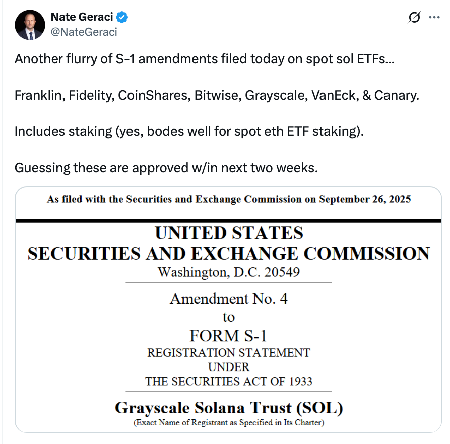 Среди них ETF Solana от Bitwise, Fidelity, Franklin Templeton, CoinShares, Grayscale Investments, Canary Capital и VanEck, которые подали обновленные документы S-1 с SEC для обновления положений своих фондов о стейкинге.
