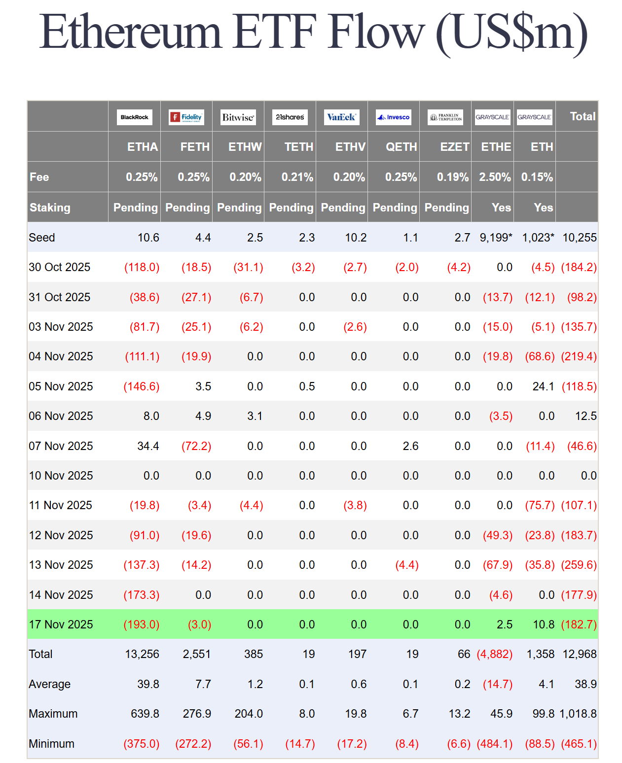 Спотовые ETF на эфир также продолжали фиксировать значительные оттоки в понедельник, с общим оттоком в $182,7 млн, по данным Farside Investors. Наибольший ущерб понес iShares Ethereum Trust ETF от BlackRock, из которого за один день ушло $193 млн.
