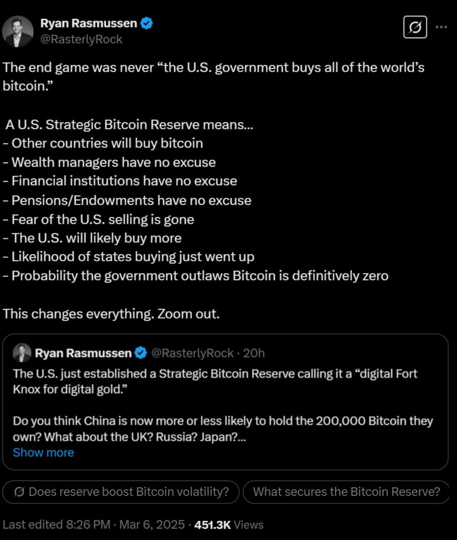 Даже если правительство США активно не покупает биткоины, то «Стратегический резерв биткоинов США означает, что... Другие страны будут покупать биткоины... [и] финансовые учреждения не имеют оправдания» для того, чтобы не добавлять BTC в свои портфели, сообщил Райан Расмуссен, руководитель исследовательского отдела Bitwise, в посте на платформе X.