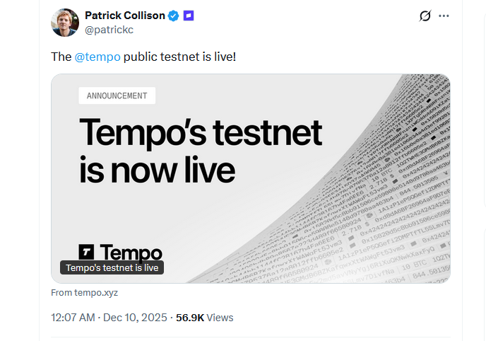 Тестнет появился через четыре месяца после того, как Stripe и Paradigm впервые презентовали Tempo, и три месяца спустя после того, как он привлек $500 миллионов при оценке в $5 миллиардов. Проект начал работу с ключевыми партнерами по дизайну, такими как OpenAI, Deutsche Bank, Standard Chartered и Shopify.