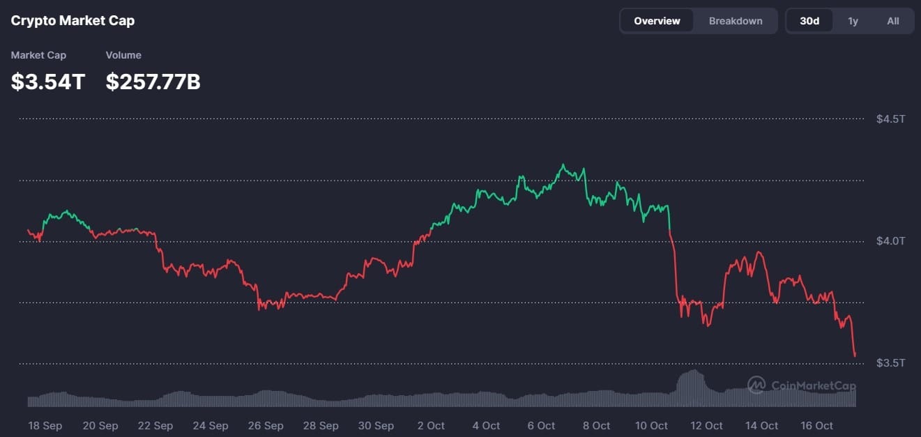 По данным CoinMarketCap, в пятницу общая капитализация крипторынка упала до приблизительно $3,54 триллиона, что на 6% ниже, чем $3,78 триллиона на предыдущий день. Это стерло более $230 миллиардов из стоимости сектора, что стало одним из самых резких однодневных падений за последние месяцы.